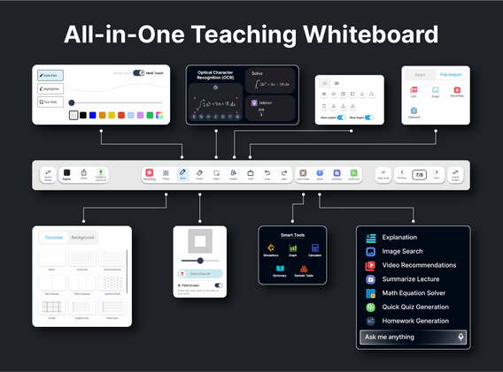 Record lessons, use OCR for text recognition/solving math equations, draw shapes with precise measurements, two side writing pen, import PDFs, auto-save lessons, enjoy an infinite canvas, launch quick quizzes & conduct live classes seamlessly.
